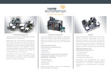 HAHN Automation is an internationally operating manufacturer of special machinery and develops innovative solutions for the automation of assembly and testing processes. Through many years of experience, innovative developments and high quality awareness, HAHN Automation has developed into one of the world's leading mechanical engineering companies with more than 25 years of experience.
